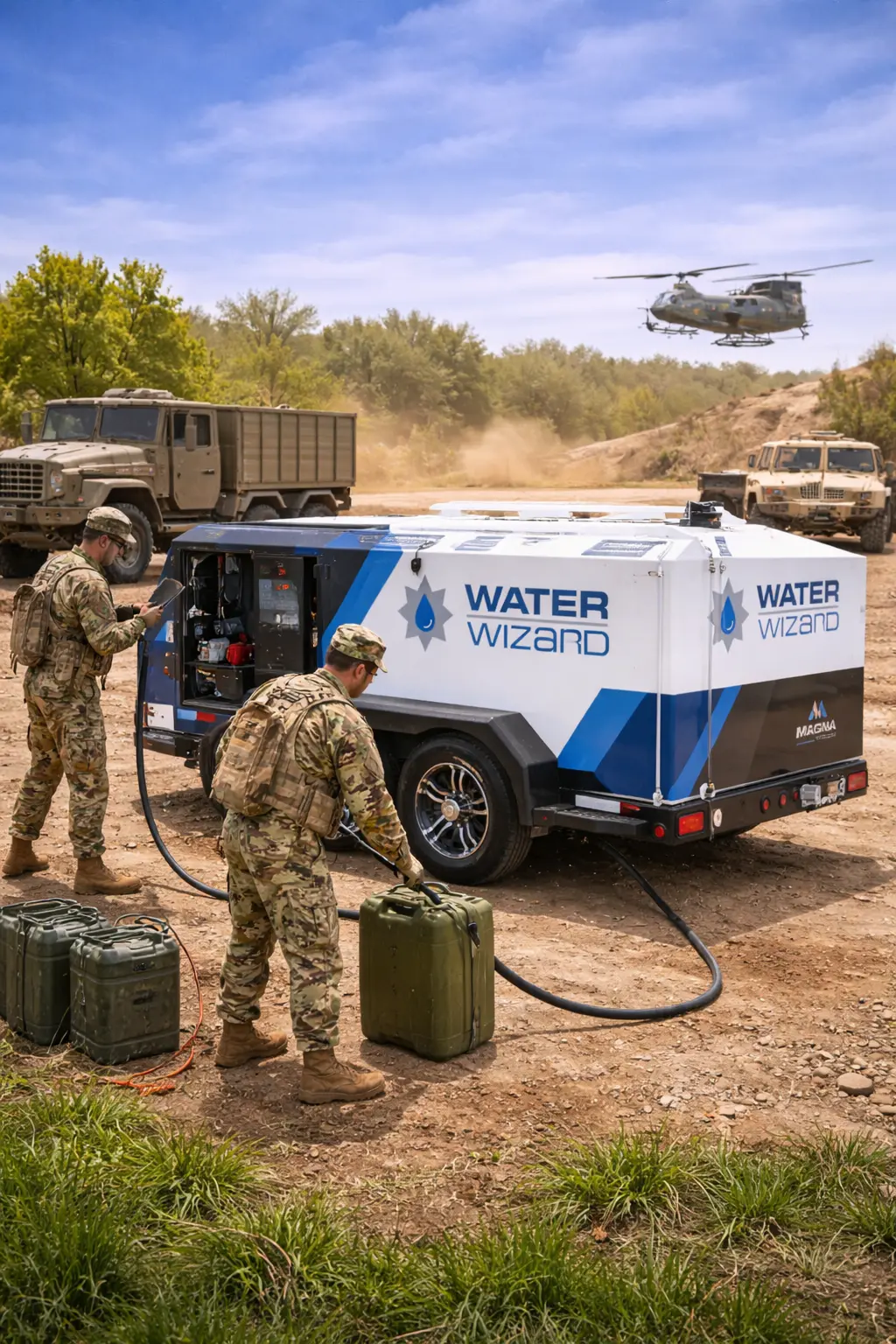 Military operations frequently take place in environments where permanent infrastructure is unavailable. The Water Wizard® is Magna Manufacturing’s patent-pending portable water tank for military operations, engineered to deliver controlled mobile water supply wherever field operations require it.